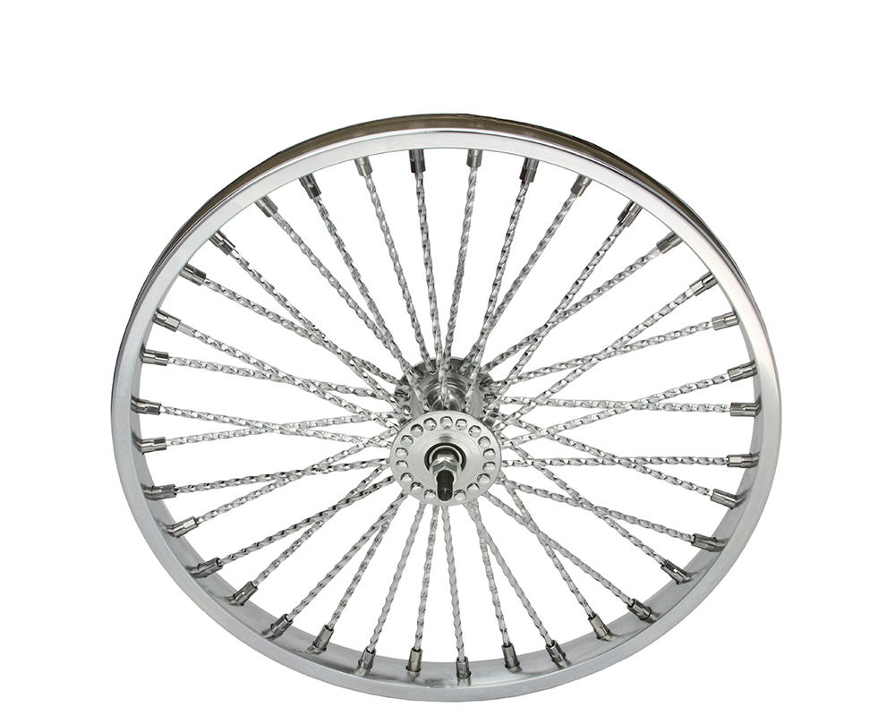 20 Inch x 32mm Steel Front Wheel Twisted 36 Spoke 8GChrome 3/8 Axle Single Wall Chrome.