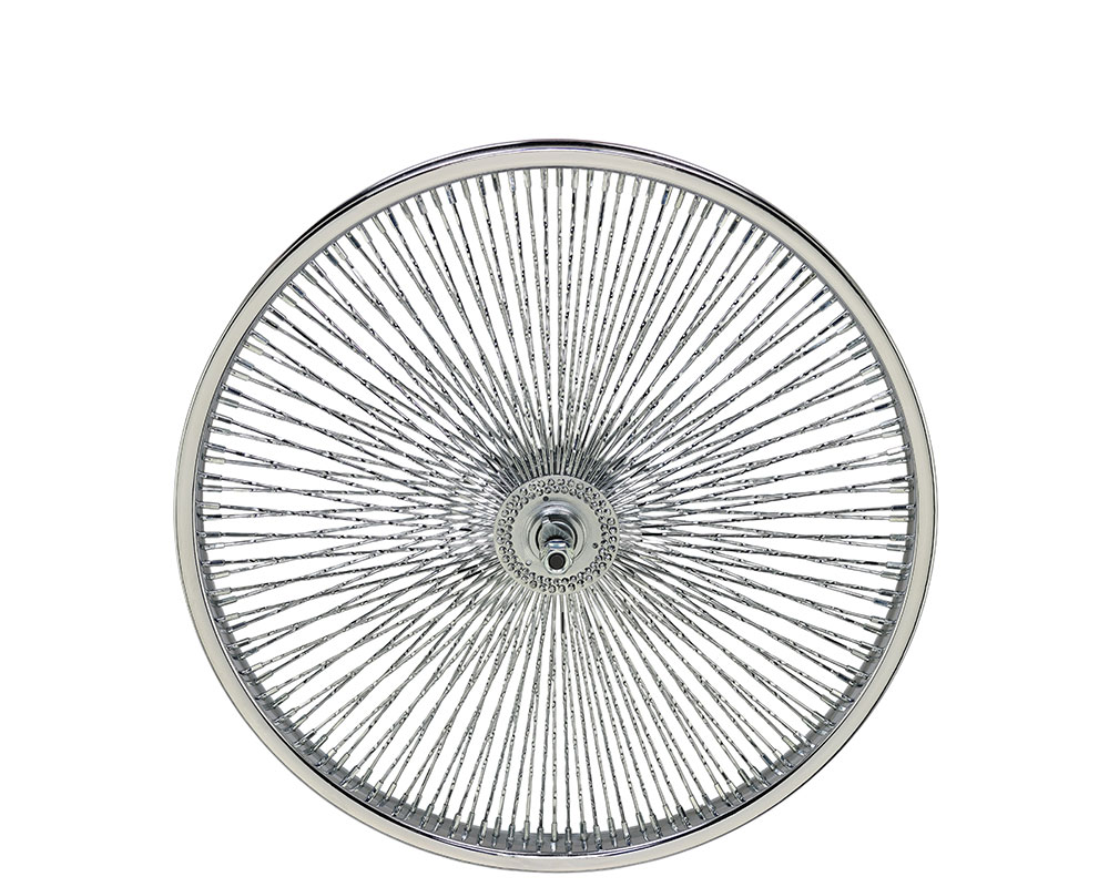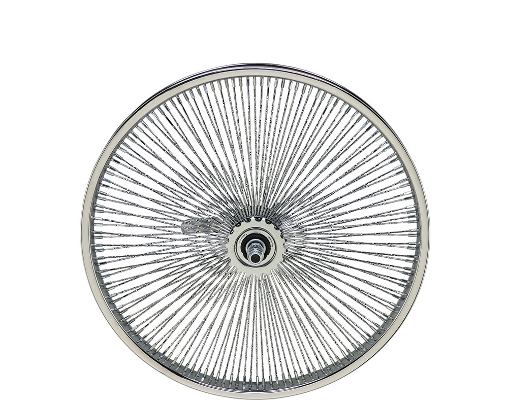 20 Inch x 32mm Steel Front Twisted Wheel 144 Spoke 14G Chrome 3/8 Axle Single Wall Chrome.