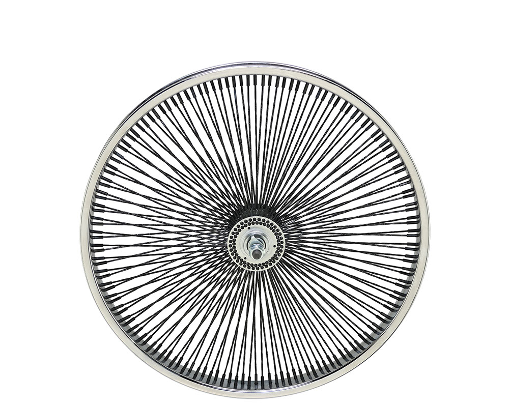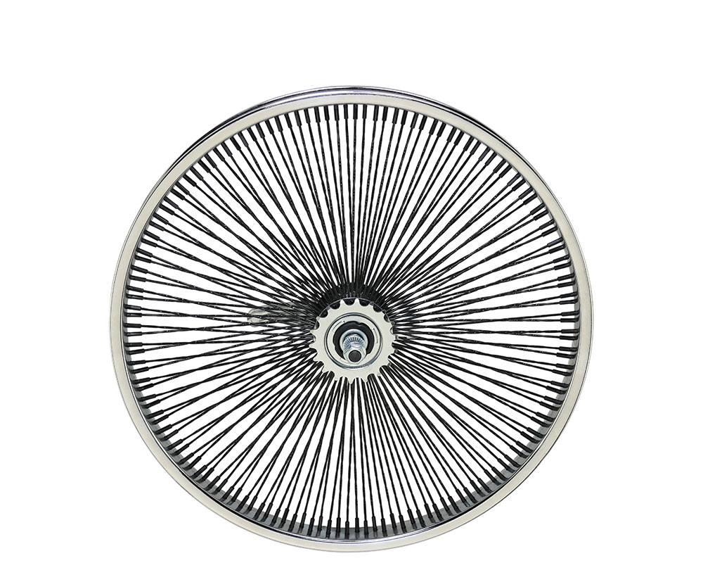 20 Inch x 32mm Steel Front Twisted Wheel 144 Spoke 14G Black 3/8 Axle Single Wall Chrome/Black.