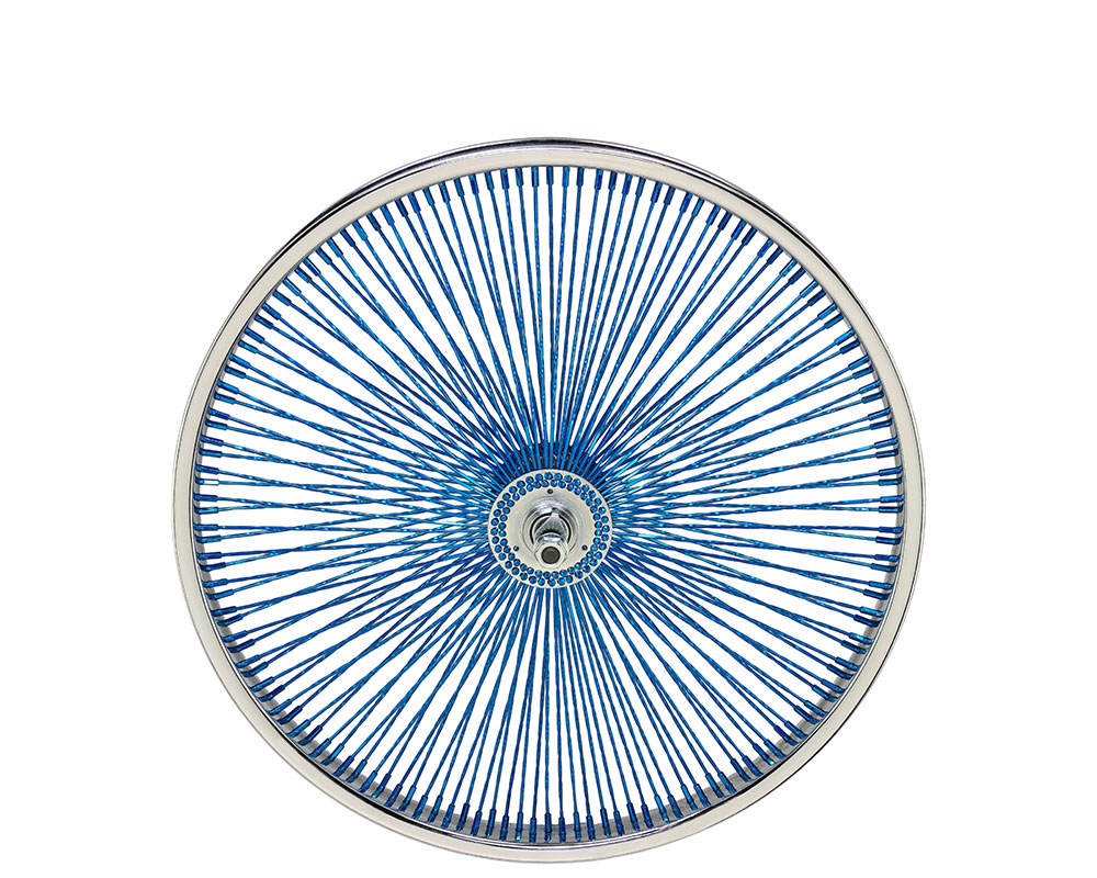 20 Inch x 32mm Steel Front Twisted Wheel 144 Spoke 14G Blue 3/8 Axle Single Wall Chrome/Blue.