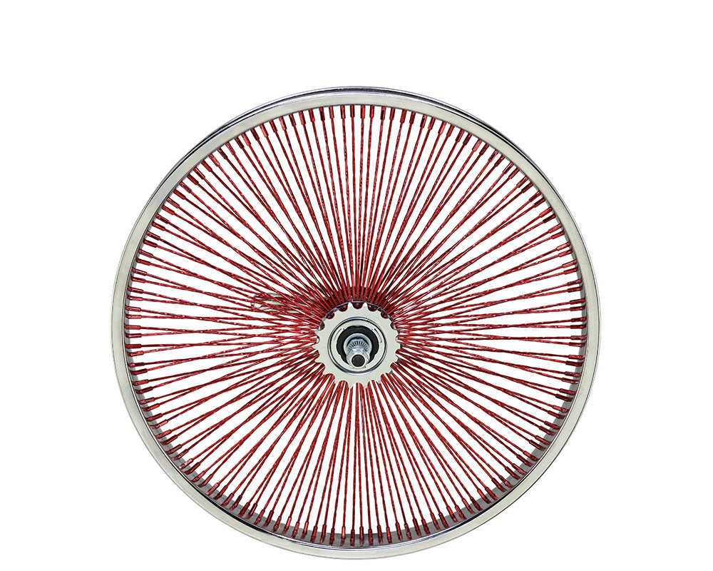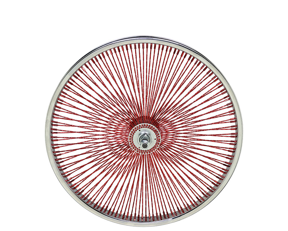 20 Inch x 32mm Steel Front Twisted Wheel 144 Spoke 14G Red 3/8 Axle Single Wall Chrome/Red.