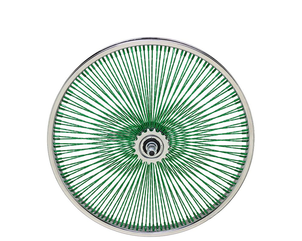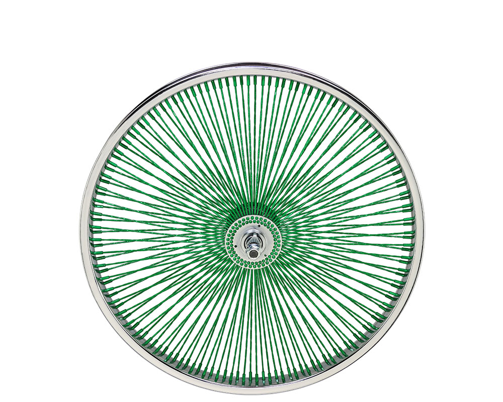 20 Inch x 32mm Steel Front Twisted Wheel 144 Spoke 14G Green 3/8 Axle Single Wall Chrome/Green.