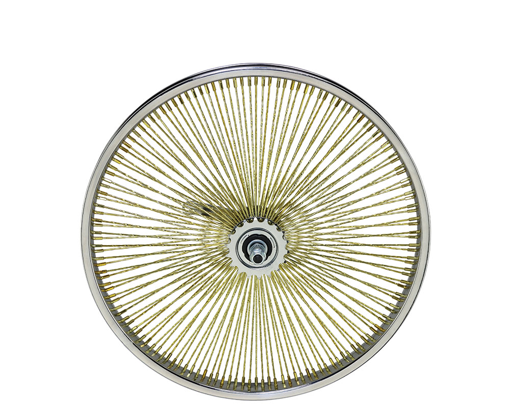 20 Inch x 32mm Steel Front Twisted Wheel 144 Spoke 14G Yellow-Gold 3/8 Axle Single Wall Chrome/Yellow-Gold.